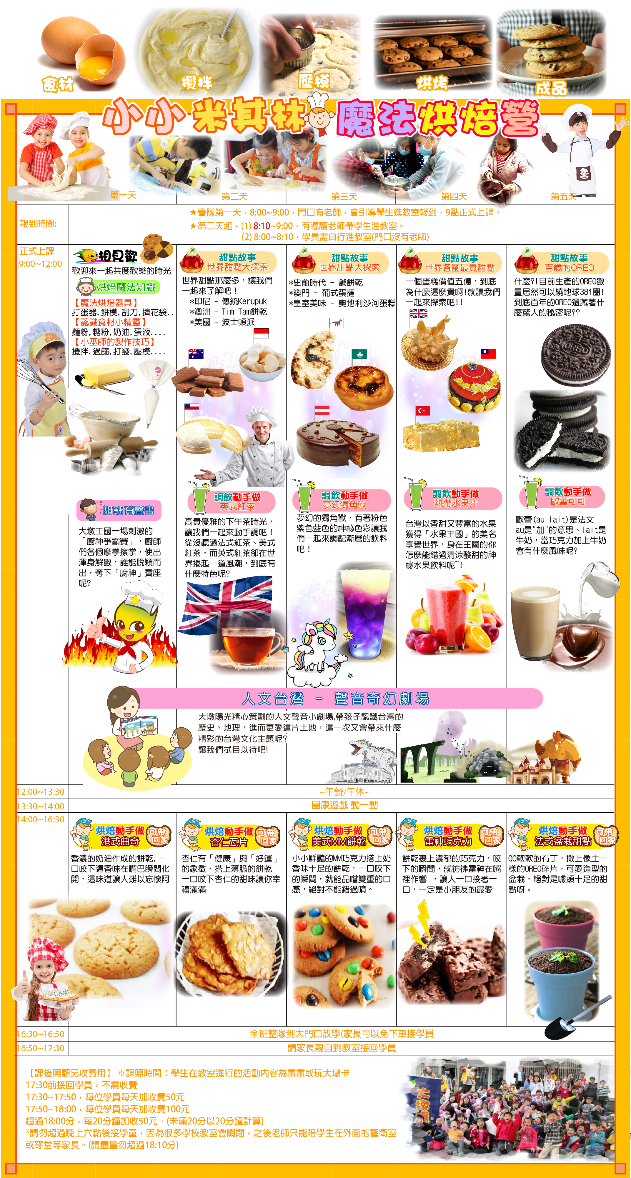 (2)烘焙的魔法森林中,發揮想像力,掌控時間,增進人際關係,從烘焙中學知識技能,成為一個小小米其林-烘焙魔術師。