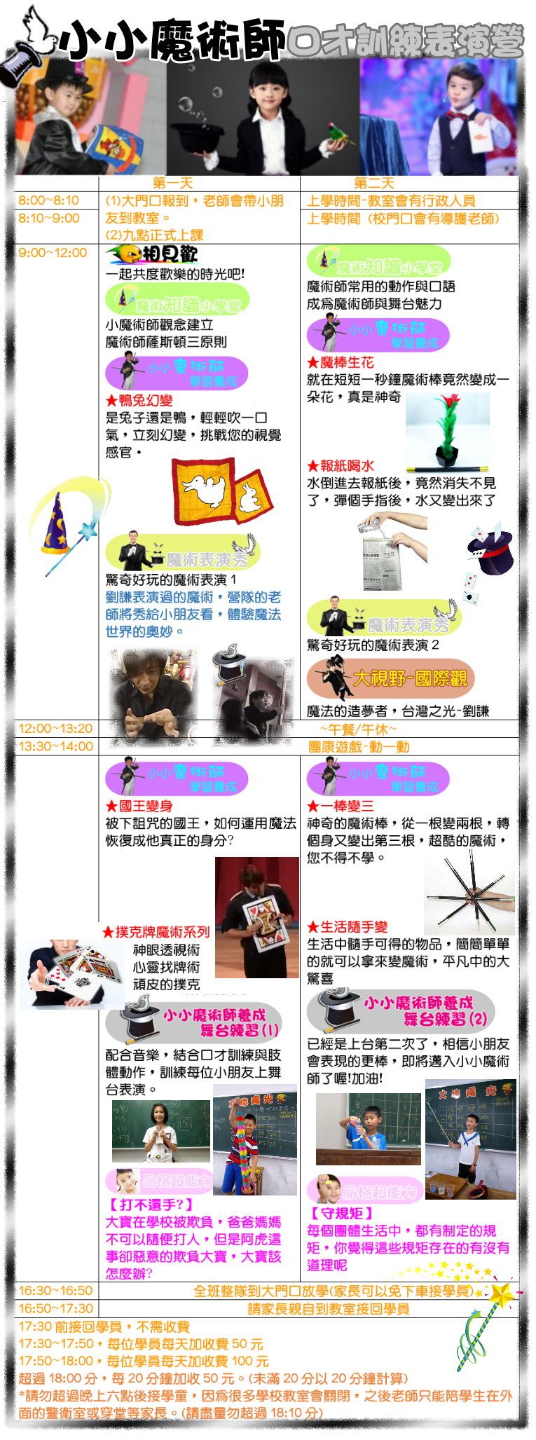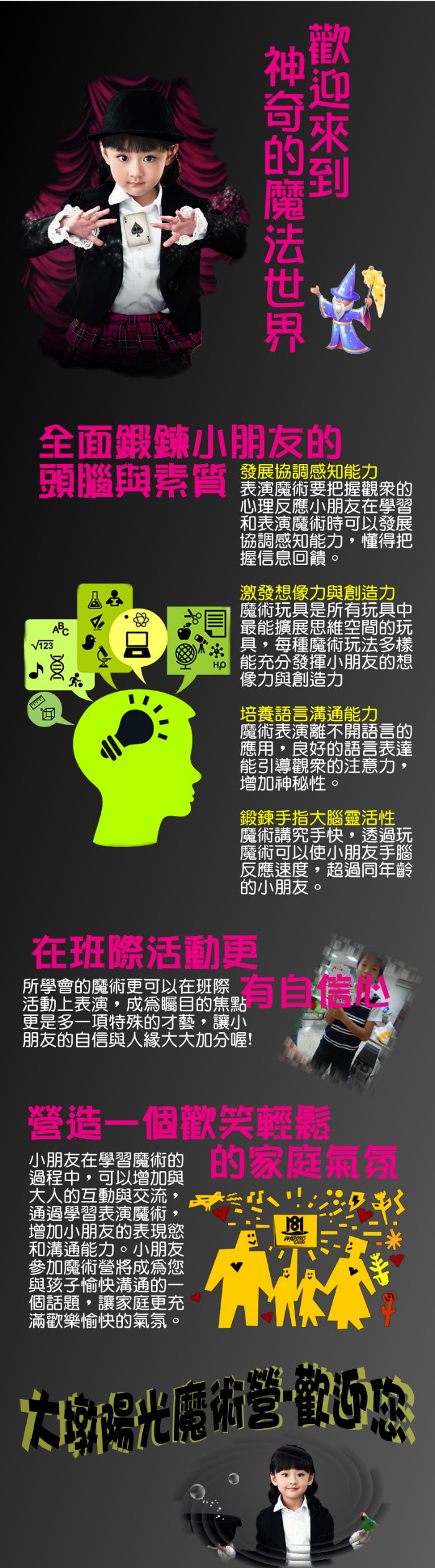 魔術教法將結合舞台表演訓練,讓每個小朋友不只會變魔術,更會表演魔術。從口才訓練,肢體開發,