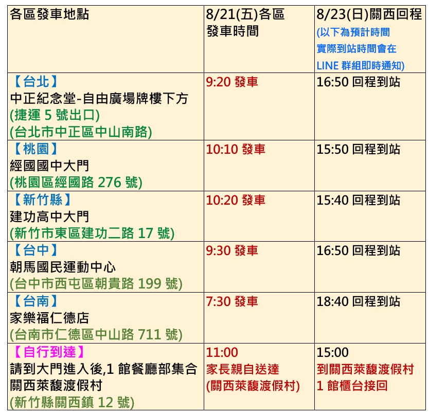 回程時間請參考上面時間表,若因交通狀況延誤時間