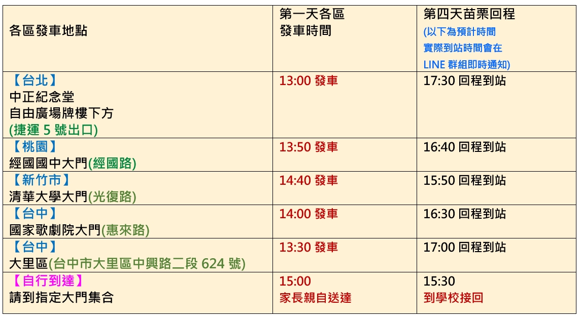 (1)會有專車從營區送回各地集合點