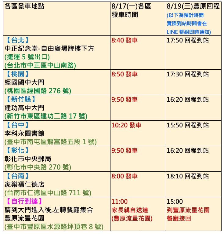 只有活動當地(台中豐原),或出發地(您的上車地點)