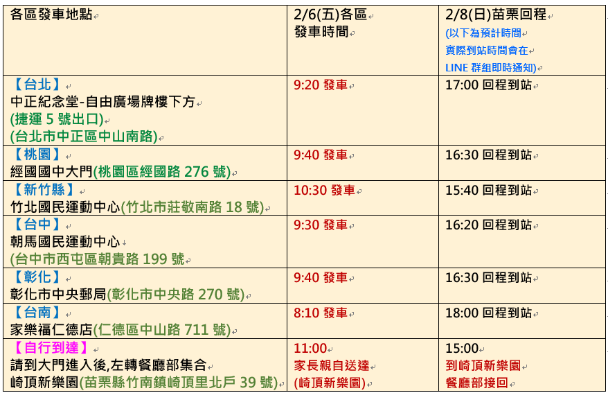 回程時間請參考上面時間表,若因交通狀況延誤時間