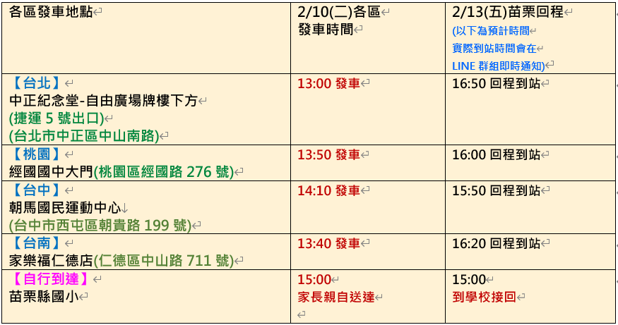 回程抵達時間停靠時間僅供參考,可能視當日路況影響前後調整![]()