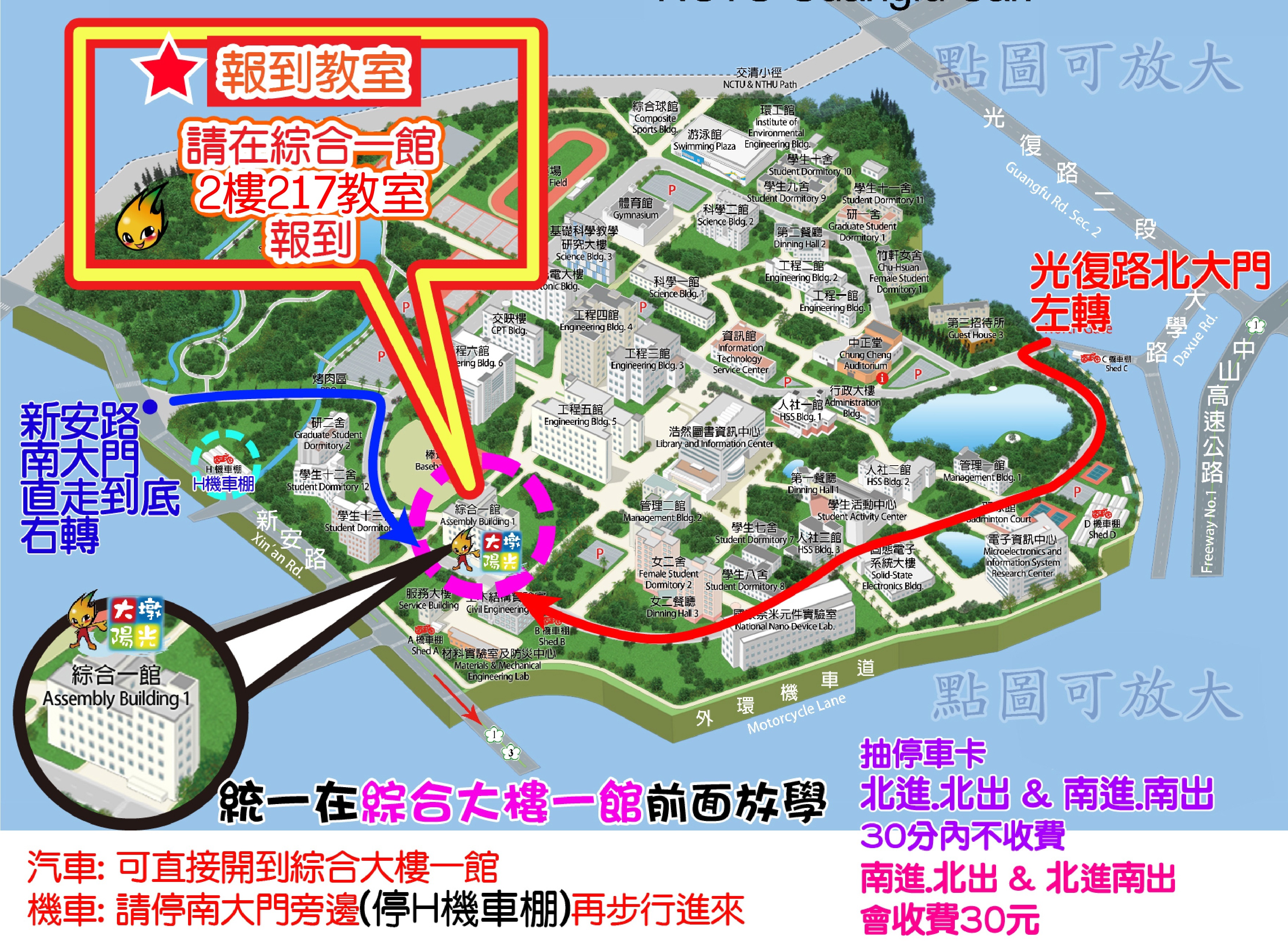 ●騎車請至南大門H機車棚再走路進來 (切勿停A機車棚,因A機車棚限校內生使用且需磁釦) 詳情請參考上面教室附圖
