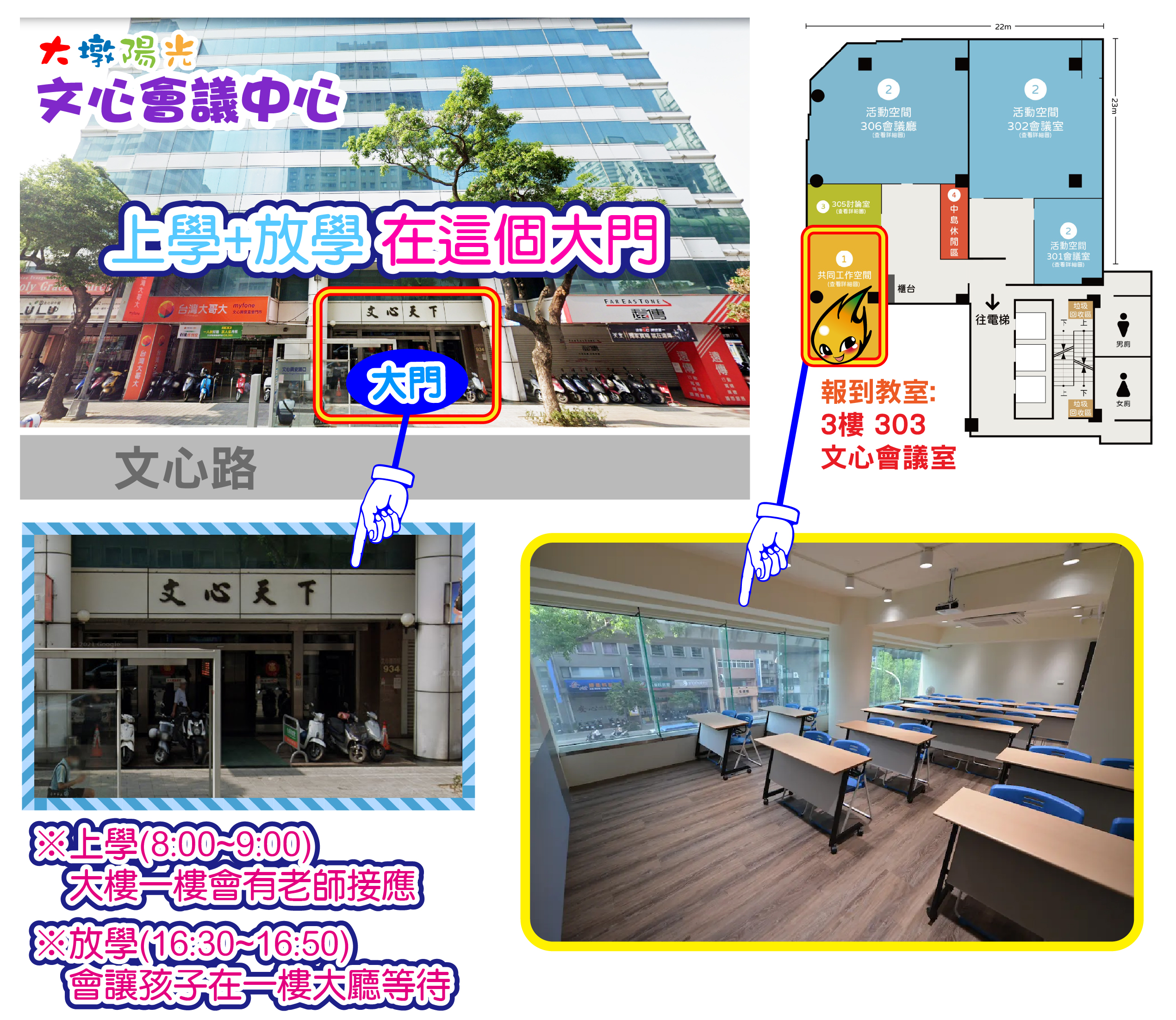 第一天報到時間8:00~9:00,第二三四五天門口導護8:00~9:00】 「文心會議室」路線說明:https://youtu.be/UE4F7PT_aZk